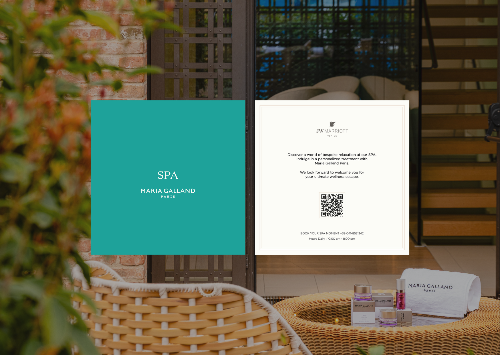 Des supports de communication qui reflètent l'excellence et le raffinement des trois univers (JW Marriott, Maria Galland Paris, et Venise), créant une expérience client fluide et luxueuse du début à la fin du parcours spa.